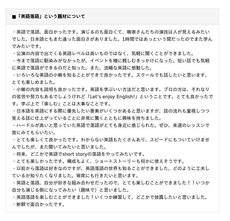 本イベントでは、45名の生徒様とご家族様に参加いただき、まずは英語で落語を聞くことを純粋に楽しんでいただきました。