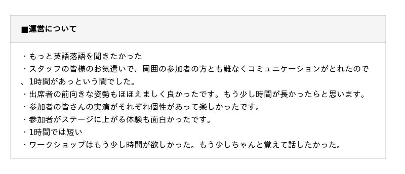 また、参加者の皆さんからは「英語落語そのものへの興味がわいた」「自分でもやってみたい」「来週イーオンで英語小噺を披露してみようかな」「忘年会に向けて練習しておこうかな」「面白いので1時間では足りない」というお声をいただきました。このように、楽しく実践することでイーオンでの体験価値をより高めていただけるようなイベントを今後も開催してまいります。