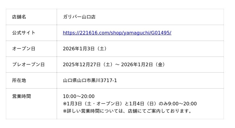 ガリバー山口店(山口県山口市) :2026年1月3日(土)