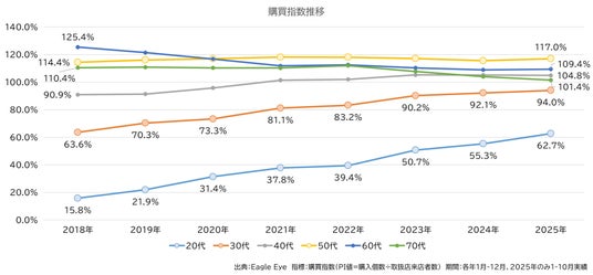 一般用漢方薬市場において購入個数と来店者数を基に算出した購買指数の変遷を時系列でみると、直近7ヶ年で20代・30代の漢方薬需要に増加傾向が見られました。また、50代の中高年層では依然と高い値を示しています。この結果から、現代の漢方薬の主要ターゲットは若年層と中高年層であることが窺えます。