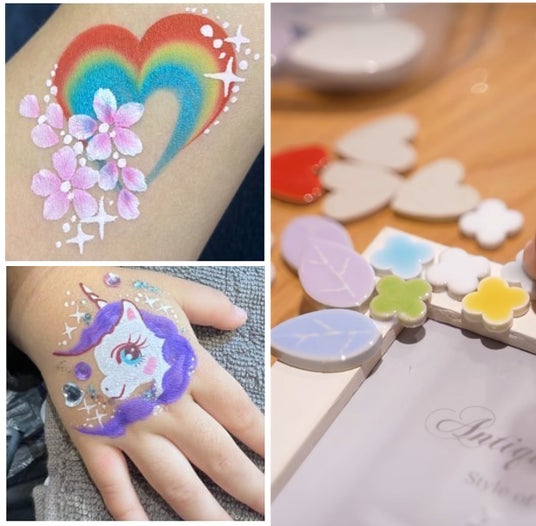 ボディや顔にキラキラを装飾できるペイントアートや、花やハートのモチーフのカラフルなタイルを装飾できるクリスマスフォトフレーム作りを体験できます。