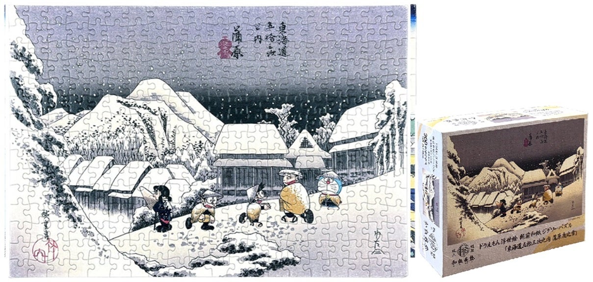 今回ジグソーパズルになったのは、葛飾北斎の「富嶽三十六景 東海道品川御殿山の不二」と歌川広重の「東海道五十三次之内 蒲原 夜之雪」をモチーフにしたドラえもん浮世絵2作品です。