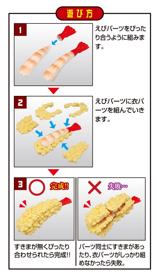 『解体パズルLite えび天パズル』はサクサクの衣パーツ12個、えびパーツ4個を正しく組み合わせてえび天を2本、完成させる立体パズルです。