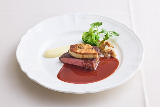 黒毛和牛モモ肉のポアレとフォアグラのロッシーニ仕立て トリュフ香るマデラソース クリスマス島の塩を添えて