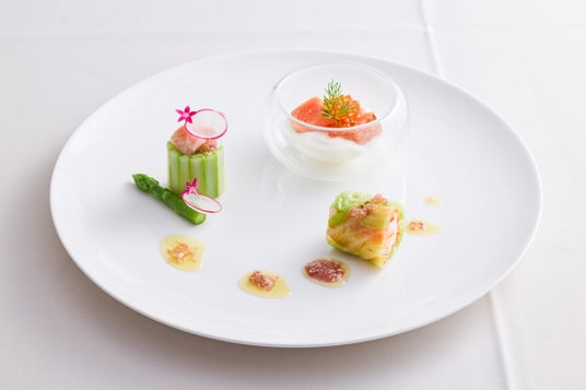 グリーンアスパラガスとズワイ蟹のシャルロット(左)