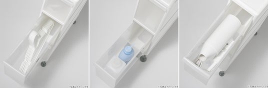 幅約15cmのスリム設計のため、ご家庭のほとんどの隙間にフィット。洗剤やティッシュペーパーなどのストックや、洗濯ハンガー、ドライヤーなどのかさばる生活用品をすっきり収納していただけます。