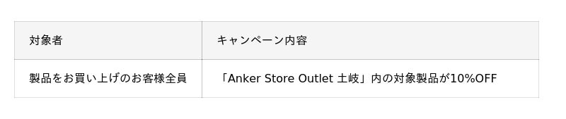 2025年12月12日(金)~ 2025年12月21日(日)の10日間限定で「Anker Store Outlet 土岐」内の対象製品が割引になるオープン記念キャンペーンをご用意しております。