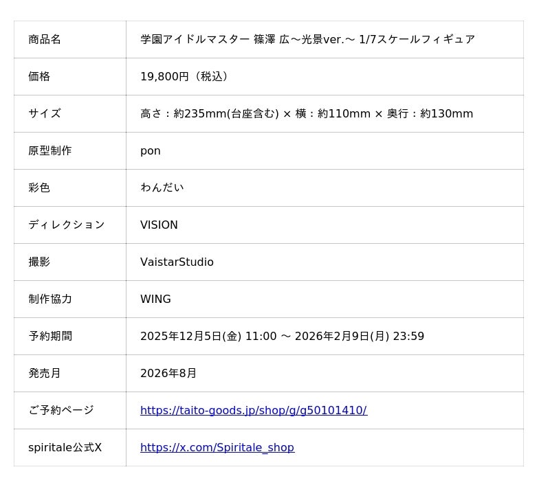 株式会社タイトー(本社:東京都新宿区、以下タイトー)は、魅力的な表情の再現と細部のディテールまでこだわり抜いた高品質キャラクターフィギュアを展開するブランド「spiritale (スピリテイル)」の新商品として、学園アイドルマスター 篠澤 広~光景ver.~ 1/7スケールフィギュアを発売いたします。2025年12月5日(金)11:00より、ECサイト「TAITO GEAR&GOODS」(URL:https://taito-goods.jp/shop/default.aspx)にて予約受付を開始します。