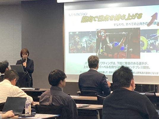 前半はスライド投影による講演形式でパラ・パワーリフティング活用をされている3社様からの事例紹介と、パラ・パワーリフティング連盟からのご提案ということで、パラ・パワーリフティングの唯一無二性を活用した体験会の意義、科学的根拠、効能など、ご紹介させていただきました。