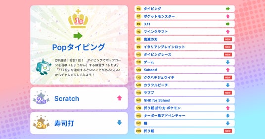 2025年の「総合」ランキングにおいては、1分間でどれだけ多くのポップコーンを召喚できるかに挑戦するタイピングゲーム「Popタイピング」が、昨年に続いて1位になりました。2位には、プログラミング教材の「Scratch」がランクインし、1位の「Popタイピング」、3位の「寿司打」、4位の「タイピング」などタイピング練習に関連するキーワードと合わせて子どものデジタル化への対応意識の高さが伺えます。