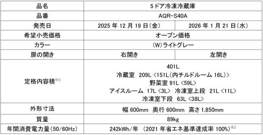 アクア株式会社(本社:東京都中央区、代表取締役社長 兼 CEO:杜 鏡国)は、奥行60cm×幅60cmのコンパクト設計ながら定格内容積401Lの大容量を実現した5ドア冷凍冷蔵庫「AQR-S40A」を、2025年12月19日(金)より順次発売いたします。