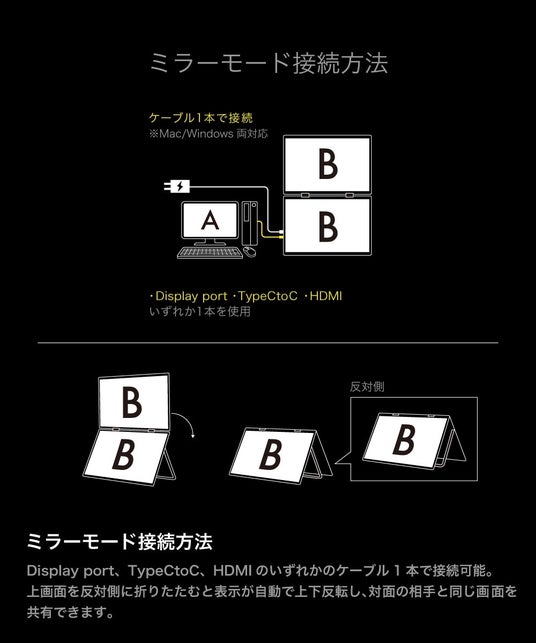さらに、2枚を合わせて大画面にする「フルスクリーンモード」や、対面の相手に画面を見せる「ミラーモード」など、用途に合わせて変幻自在。