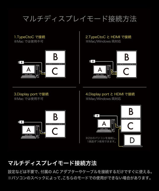 ・セット内容/本体、日本語取扱説明書、USB TypeC to Cケーブル、給電用USB TypeC to Cケーブル、ACアダプター、HDMIケーブル、Display portケーブル