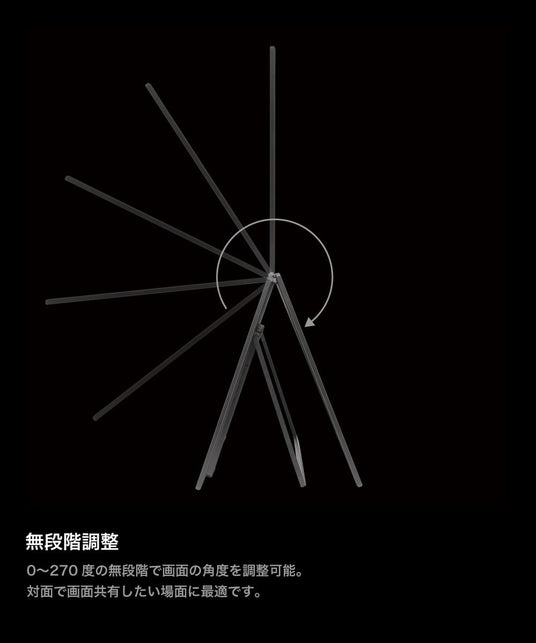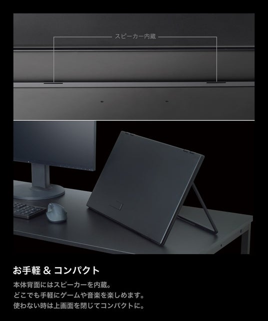 0~270度の無段階角度調整、VESAマウント対応、スピーカー内蔵と機能も充実しており、使わない時は折りたたんでコンパクトに収納可能です。