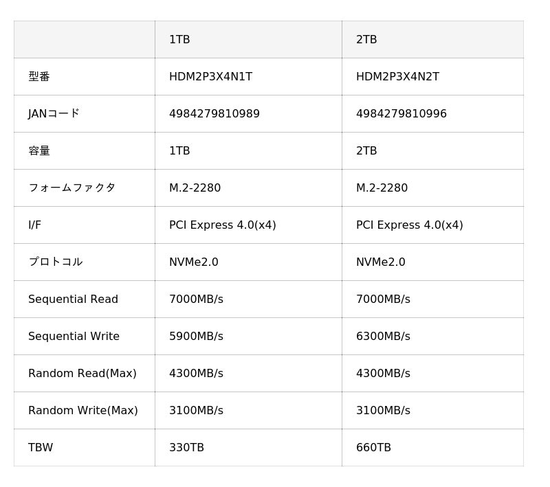 内蔵型SSD 2TB型番:HDM2P3X4N2T