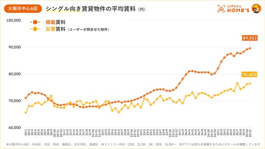 - 大阪府下の掲載賃料は80,588円(前年同月比106.5%)で過去最高を更新
