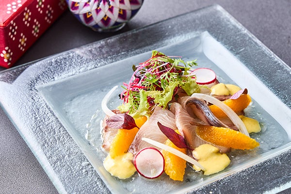 北陸産鰤のカルパッチョ 柑橘ソース ¥2,600脂がのり深みのある濃厚な旨みと、身が引き締まりプリっとした食感を楽しめる旬の「北陸産鰤」をご用意しました。食材の味をしっかり堪能いただけるように、シンプルにカルパッチョでご提供します。オレンジやビーツ、ピクルスなどをあしらいサラダ仕立てにし、柚子のアクセントをつけたオレンジソースと合わせてお召し上がりください。