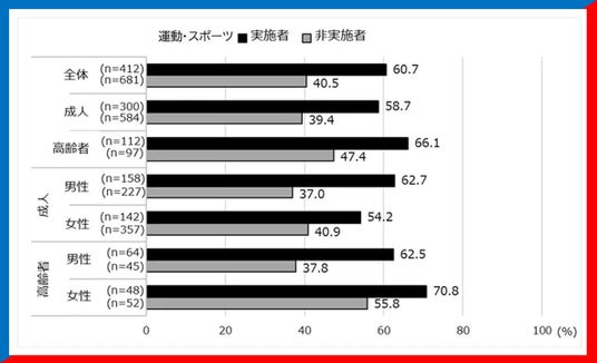 ● 推奨身体活動量の達成率:運動・スポーツ「実施者」60.7%、「非実施者」40.5%であった。