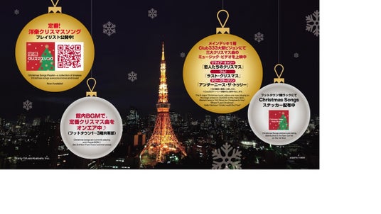 東京タワーの高さ150mの展望フロア:メインデッキにある“Club333”の4K巨大スクリーンにて、三大クリスマス曲のマライア・キャリー「All I Want For Christmas Is You」、ワム!「Last Christmas」、ケリー・クラークソン「Underneath The Tree」のミュージック・ビデオの上映、館内1階チラシコーナーにて「Christmas Songs×Tokyo Towerステッカー」を無料配布、さらに、館内BGM(1階~3階フットタウン共有部内)では『定番!洋楽クリスマスソング』プレイリストから楽曲が一部オンエアされます。同プレイリストには、先述の3曲の他、ザ・ロネッツ「Sleigh Ride」、セリーヌ・ディオン「Happy Xmas(War Is Over)」、エルヴィス・プレスリー「Blue Christmas」、ホイットニー・ヒューストン「Joy To The World(with Georgia Mass)」、ブリトニー・スピアーズ「My Only Wish(This Year)」、ペンタトニックス「Hallelujah」、レイヴェイ「Santa Claus Is Coming To Town」、カミラ・カベロ「I‘ll Be Home For Christmas」等、往年のクリスマスソングから、最新クリスマスヒットまで、新旧問わず、バラエティに富んだ誰もが楽しめるスペシャルなプレイリストとなっています。