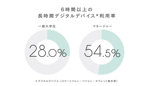 また、6時間以上デジタルデバイスを利用する一般大学生は28%である一方、マネージャーは54.5%と過半数に達しており、長時間利用者の割合は約2倍という結果となりました。