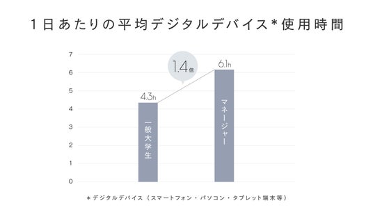 1日のデジタルデバイス使用時間を比較したところ、一般大学生の平均は4.3時間、マネージャーの平均は6.1 時間となり、マネージャーのデジタルデバイス利用時間は、一般大学生の約1.4倍であることが判明しました。