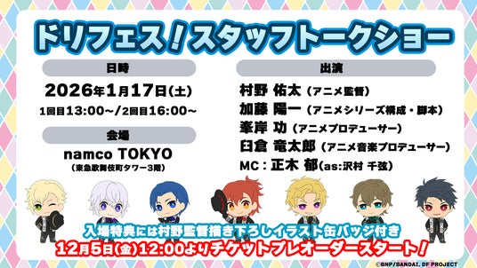 5次元(2次元+3次元)アイドル応援プロジェクト『ドリフェス!』シリーズのスタッフによる「ドリフェス!スタッフトークショー」が1月17日(土)、namco TOKYO(東急歌舞伎町タワー3階)にて開催決定!