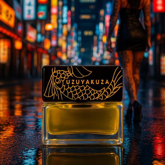深夜の新宿、濡れた路地に灯る名誉の光。鋭く閃く柚子がアスファルトと混じり、熱を帯びて肌を撃つ。墨と雨が呼び起こす、刺青の儀式。スエードと紙幣、煙とウイスキーが囁く、沈黙と誓い。魂に刻まれる通過儀礼。