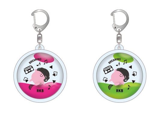 RKBのマスコットキャラクター「ももピッ!」が、ヘッドホンとニット帽姿でブレイキンを楽しむドーム型キーホルダーです。優しく揺らすと、ヘッドスピンやウィンドミルさながらのパワームーブを披露します。