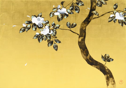 満開の桜から放たれる、優しくほのかな花の香りが街角を包み込み、一瞬一瞬を詩のようなひとときへと変えていく時。自然が生み出す1年に1度の特別な季節を祝し、特別リップケース〈ルージュ ジェ チェリー ブルーム〉が2024年1月に誕生しました。品川亮氏の手がけた、ゴールドの背景に桜の花が舞う様子を表現した同ケースは、17世紀から始まった琳派の驚くべき金箔絵画からインスパイアされました。その中を舞う優美な桜の花びらを力強い絵筆のタッチで描いたデザインは枠にとらわれない品川亮氏ならではの作品。「日本の絵画」に新たな技法を取り入れながらその可能性を追求しています。
