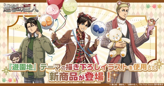 株式会社トキオ・ゲッツより、TVアニメ『進撃の巨人』のキャラクターを起用した新商品が発売されます。新規描き下ろしイラストではエレン、リヴァイ、エルヴィンが遊園地で楽しく遊んでいる様子が描かれます。さらに3人がアトラクションに乗る姿のミニキャライラストも展開。