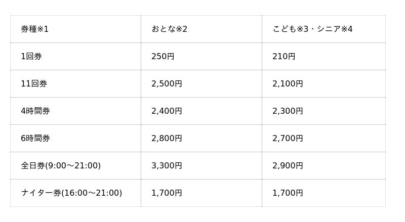 ※1.回数券は、今シーズン営業中いつでもご使用いただけます。時間券・全日券・ナイター券は、当日のみ有効。
