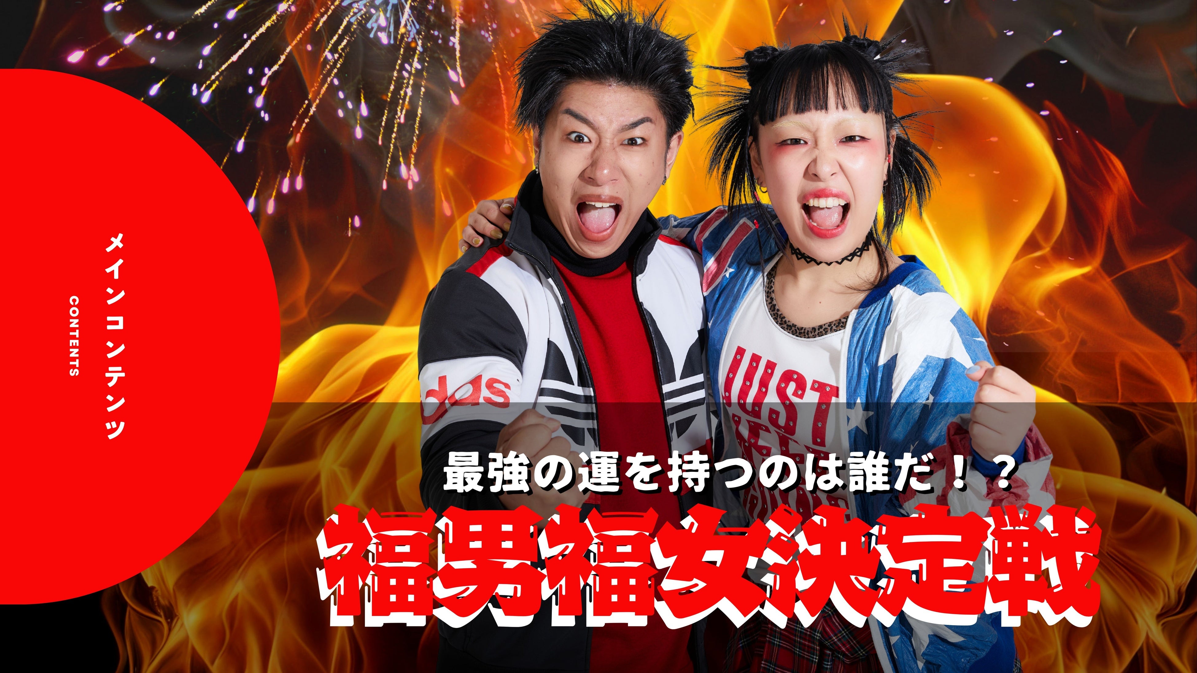 サイコロ、じゃんけん、ビンゴ、パチンコ・パチスロなど ”運” の要素が大きく勝敗を左右するバラエティ豊かな競技を行い、最も運の良い若者を決める大会「福男福女決定戦」を実施します。賞金総額77万円をかけて、若者同士の熱いバトルが繰り広げられます!