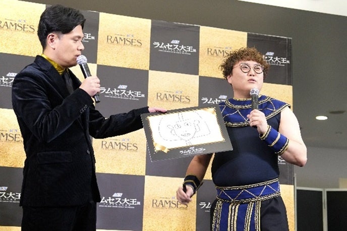 イベント中盤では、12月5日(金)からスタートする「ナイトミュージアム」の来場者限定の抽選キャンペーンを一足先に体験。ただし今回はマユリカ特別仕様として、当たった色の玉に応じて“マユリカから来場者へプレゼント(芸)を披露するというルールに。 中谷さんが引いたのは、自身の特技を披露する「ピンクの玉」。急遽、即興で「ラムセス大王 絵描き歌」を披露することになり、美大出身の画力を活かしたシュールな絵と歌で会場を笑いの渦で包みました。