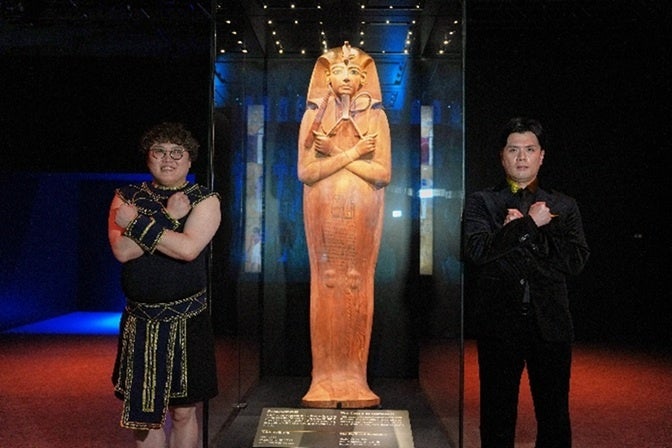 最後に、これから来場される方々へ向けてメッセージを送りました。 中谷さんは「まったく知識が無くてもすべて解説もしてくれますので、ラムセス大王展を知らない方でも楽しめると思います。是非皆さん遊びに来てください!」とコメント。一方阪本さんからは「皆さんお気づきかもしれませんが、実は僕はラムセス大王のこと知りませんでした。」その瞬間に中谷さんより「わかってたわ!」とツッコミが。「(しらなかった僕でも)くるものがありました。3,000年も前のものがとてもきれいな状態で目の前にあるのは感動します。是非来てみてください」と呼びかけ、締めくくりました。