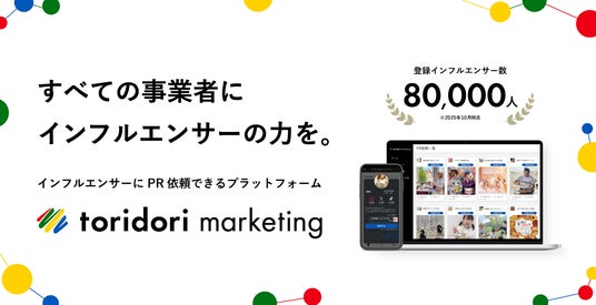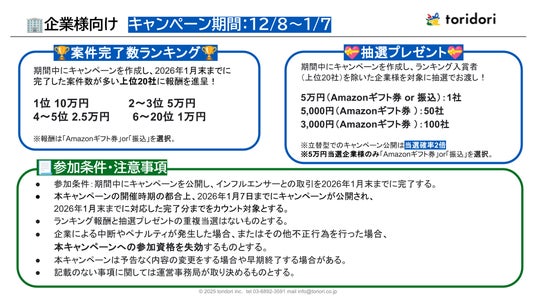 インフルエンサーマーケティングプラットフォーム『toridori marketing/toridori base(トリドリマーケティング/トリドリベース)』を中心としたインフルエンサーマーケティング事業を手がける株式会社トリドリ(本社:東京都渋谷区、代表取締役社長CEO:中山貴之、証券コード:9337、以下toridori)は、2025年12月8日(月)~2026年1月7日(水)の1ヶ月間「年末年始スタートダッシュキャンペーン」を実施することをお知らせいたします。