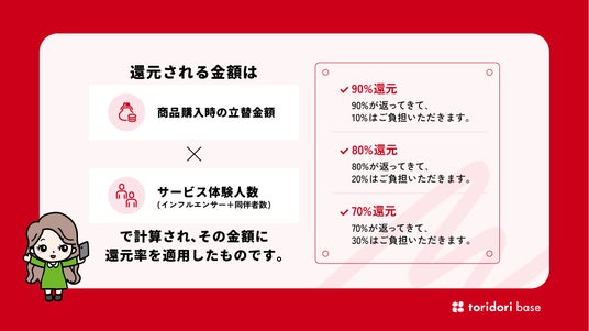 立替型のご利用で還元される金額は「商品購入時の立替金額」×「サービスを体験した人数(インフルエンサーと同伴者)」で計算され、その金額に70~90%の還元率が適用されます。
