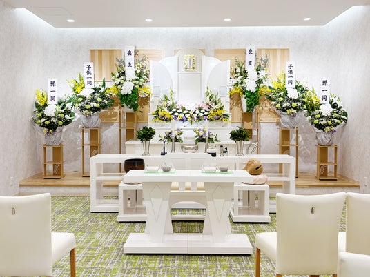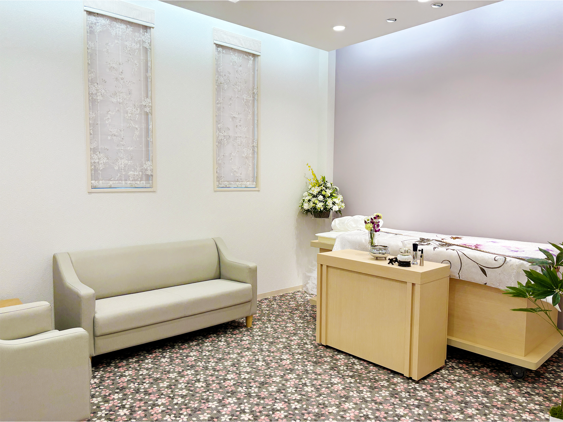 花びらがさりげなくちりばめられた空間は、故人様の生涯を讃えるとともに、大切な方の旅立ちを見送るご家族をそっと包みこみます。