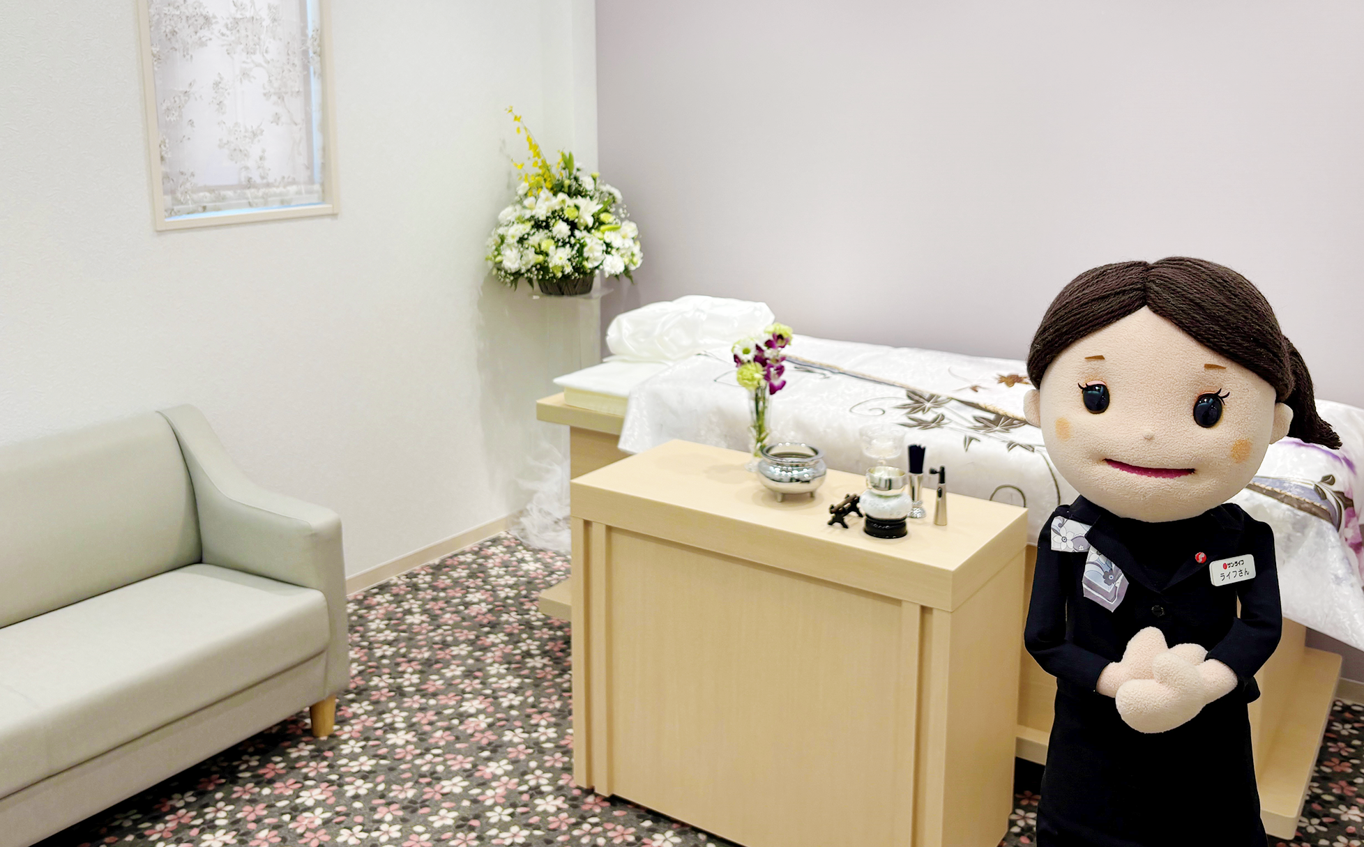 サン・ライフテレビCMでおなじみ「お葬式のお悩み相談員ライフさん」とご安置室