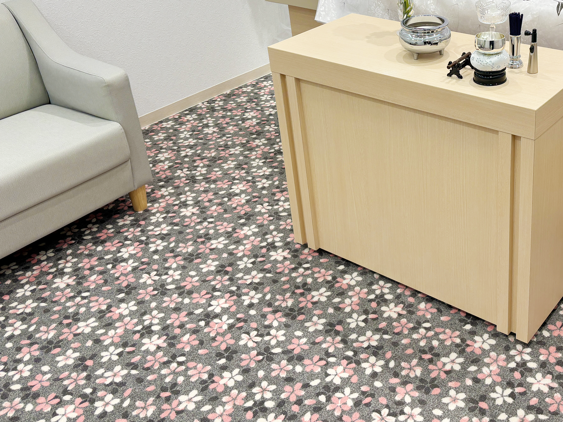 1.「桜」をモチーフにした優しい空間桜の花が持つ「儚さ」や「再生」のイメージはご葬儀の場においても大きな意味を持つと考え、壁紙やテーブルクロスなどに取り入れました。