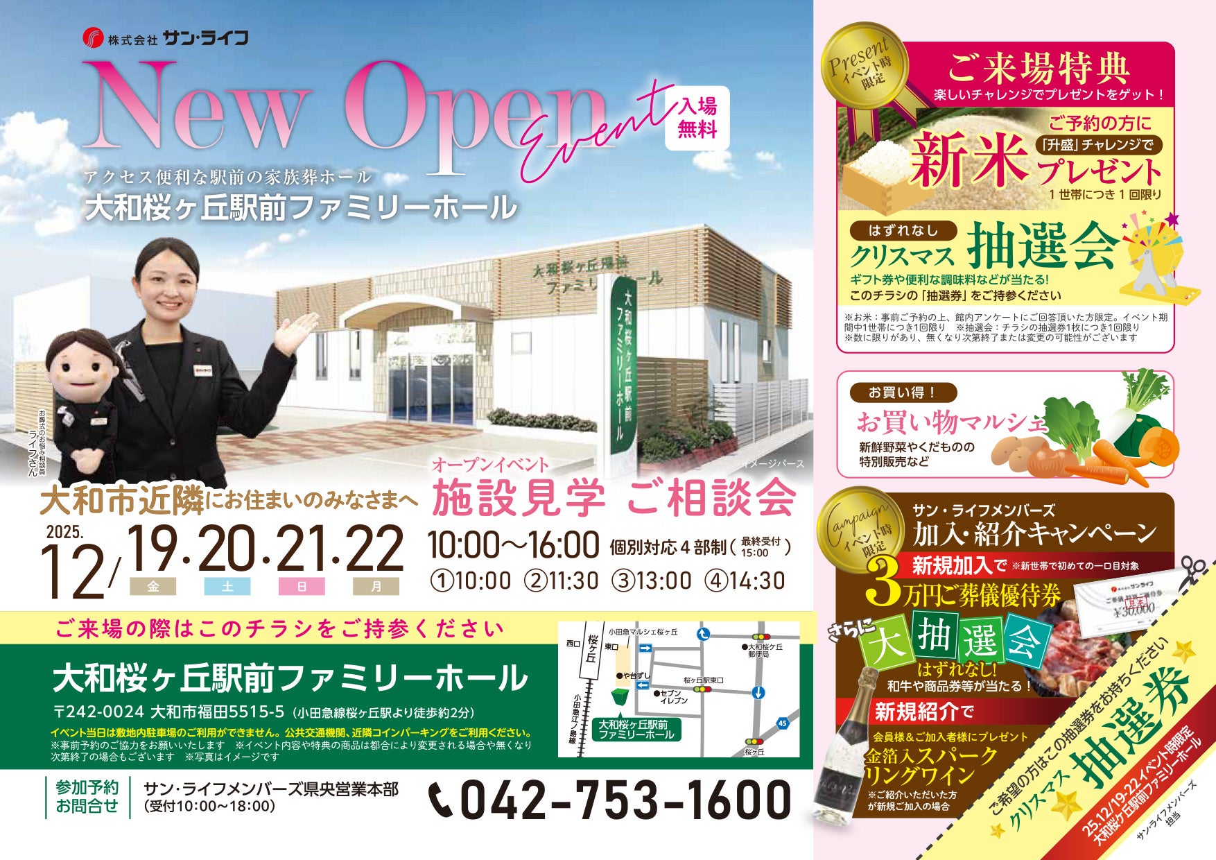 冠婚葬祭事業を運営する株式会社サン・ライフホールディング(神奈川県平塚市、代表取締役社長:比企武、以下「当社」)は、2025年12月6日(土)神奈川県大和市に家族葬ホール「大和桜ヶ丘駅前ファミリーホール」をオープンいたします。