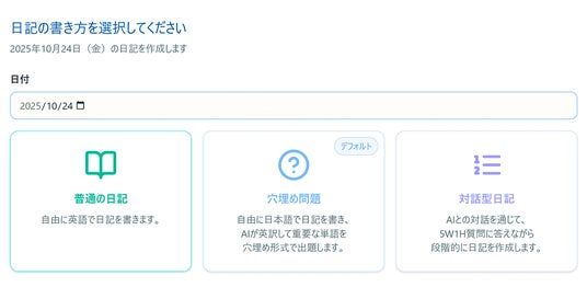 生徒は、「普通の日記」「穴埋め問題」「対話型日記」の3つの書き方から選んで日記を書くことができます。