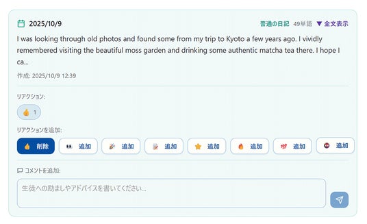 先生向けダッシュボードからは、各生徒の取り組み回数が確認できるので、サポートが必要な生徒を瞬時に確認できます。各生徒の日記の内容・添削を受けた内容を確認し、フィードバックコメント入力やスタンプ機能などで、生徒に対してリアクションすることができます。また、クラス全体への一括フィードバックも可能です。同じ内容を繰り返し入力しているなど通常と異なる利用が見られる場合には、先生へ管理画面にてアラートを上げる機能も備わっています。