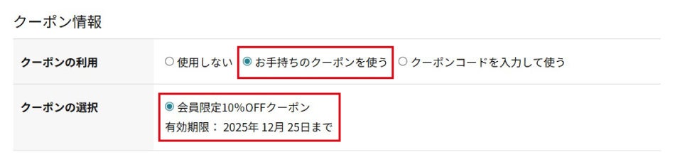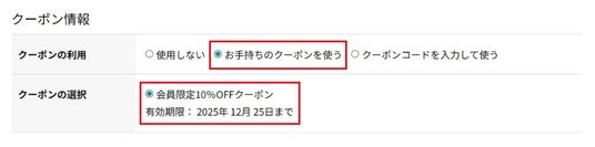 会員様はご注文の決済時に、クーポン情報欄で「お手持ちのクーポンを使う」にチェックを入れてください。「会員限定10%OFFクーポン」が表示されます。