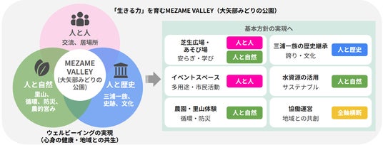 「人と人」「人と自然」「人と歴史」の関係性を軸に、地域資源を活かした体験や学び、交流、災害時の備えを統合的に設計。芝生広場やレストラン、体験施設、防災拠点などの導入機能により、多世代が関わり、暮らしと地域がつながる場づくりを進めます。