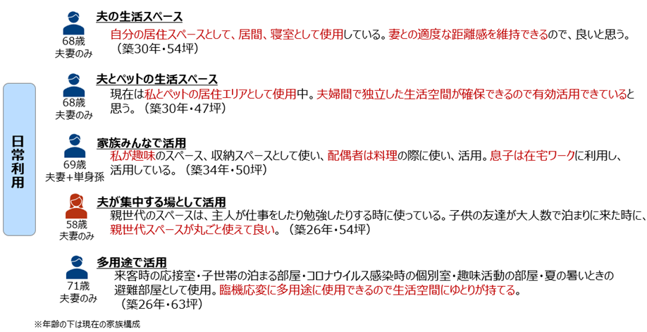 親世帯スペースの使われ方は多様化しており、収納のみで使用しているケースはわずか4%でした。一方で、居住スペースとして生活全般で使用している人が約5割、寝室や趣味、在宅ワークなど居室として活用する人が約3割に上ります。親世帯スペースは子世帯夫婦がそれぞれの暮らしに合わせて活用していることが分かりました。仕事や趣味の個室、リラックスできる専用空間を設けることで、互いの時間を尊重しながら快適な生活を実現していることが伺えます。