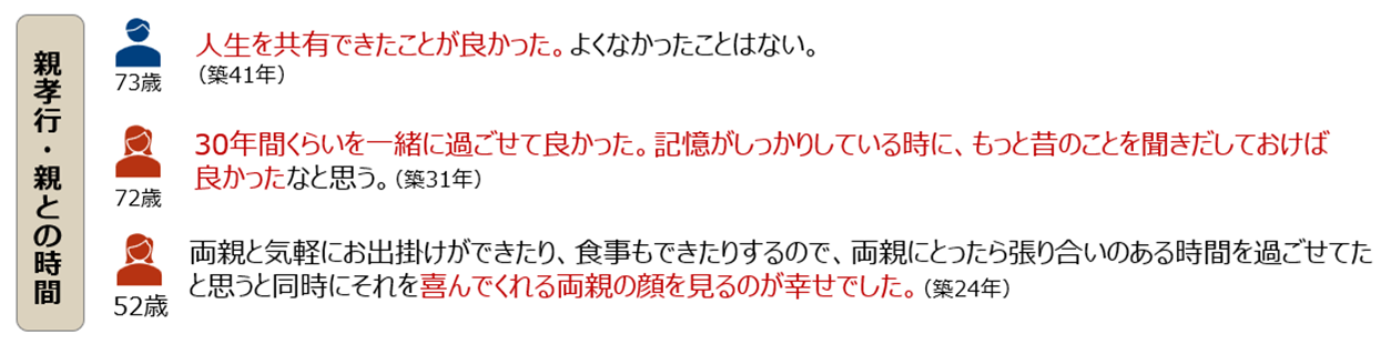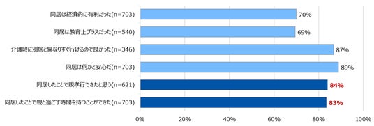 満足度の背景には、経済的メリットや育児・介護のサポートといった実利的な要因に加え、約8割が「親と過ごす時間を持てている」「親孝行ができている」と回答しました。二世帯同居は、生活空間の共有にとどまらず、家族の絆を深める場として機能していることがうかがえます。こうした情緒的価値が、長期的な満足度を支える重要な要素と考えられます。
