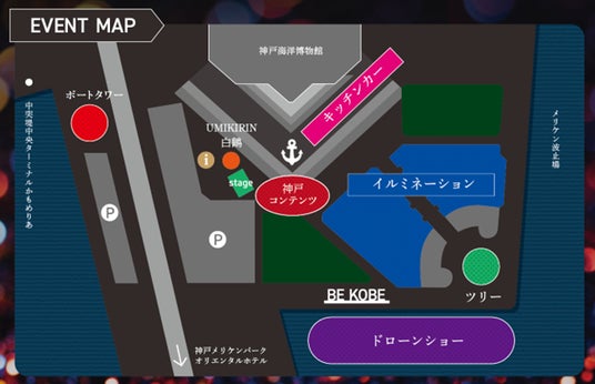 イベントのコンテンツには、500機のドローンによるショーやクリスマスツリー、イルミネーションが神戸港を幻想的に彩り、毎日20台のキッチンカーの出店やライブ&パフォーマンスショーが予定されています。