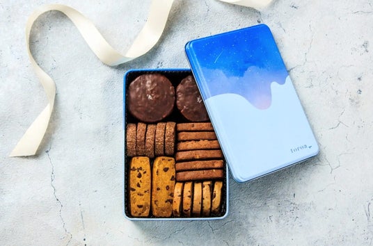 5種のクッキーをオリジナルデザイン缶に入れてお届け