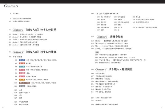 本書では、難波氏の代名詞である「温度に基づいた握りの最適化」を中心に、すしダネの仕込み、握りの技術、酒肴、コース構成、素材の選び方まで、現代の職人に必要な理論と実務を幅広く紹介しています。