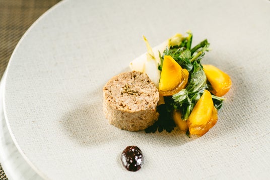 蕪と柿、春菊。鴨とほろほろ鳥のパテを赤ワインマスタード